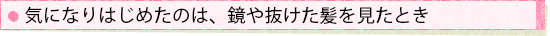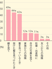 抜け毛や薄毛が気になるきっかけとして、もっとも多かったのは「鏡をみて」(49%)と約半分の方が回答。また、「抜けた髪を見たとき(44%)」「髪を洗っているとき(42%)」という回答が次いで高い結果となりました。誰かに言われて気が付くことよりも、日常の何気ないときに自分で気が付くということのほうが多いようです。