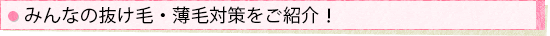- 年齢的な事もあるが、ホルモンバランスが崩れると脱毛しやすいらしいので、ホルモンバランスを整える大豆を料理に多く取り入れている。また、頭皮の血流が悪いと脱毛しやすくなるらしいので、しょうがを使ってジュースを作ったりしている[20代 女性]