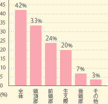 そして、抜け毛・薄毛を気にしている方の気になっている箇所としてもっとも多かったのは「全体(42%)」。一部分よりも全体的に髪が抜ける・薄くなることが気になるようです。次いで「頭頂部(33%)」「前頭部(24%)」「生え際(20%)」という結果となり、「後頭部(5%)」のように自分では普段目につかないところよりも、自分で鏡を見るなど普段何気ないときに目に入りやすい部分を気にされている傾向にありました。