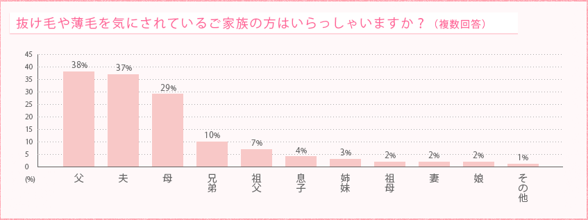 家族の中で抜け毛・薄毛を気にしている人がいますか?と聞いたところ6割の人が家族の中に抜け毛・薄毛を気にしている人がいるという結果に。また、気にしているのは「父(38%)」「夫(37%)」「母(29%)」という順に多く、やはり男性の方が気にしている方が多い結果でした。