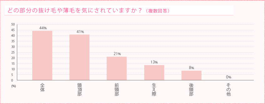 また、抜け毛・薄毛を気にしている部分は、自分が気にしているところと傾向が似ていて、「全体(44%)」「頭頂部(41%)」が上位に。