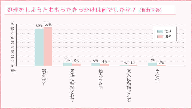 多くの人がお手入れ経験のある「ひげ・鼻毛」ですが、処理をしようと思ったきっかけはどのようなことだったのでしょうか。ひげも鼻毛も8割の人が「鏡をみて」という回答でした。やはり人に指摘されるケースは少ないようですね。