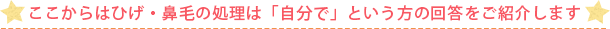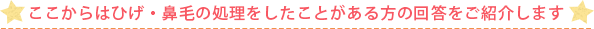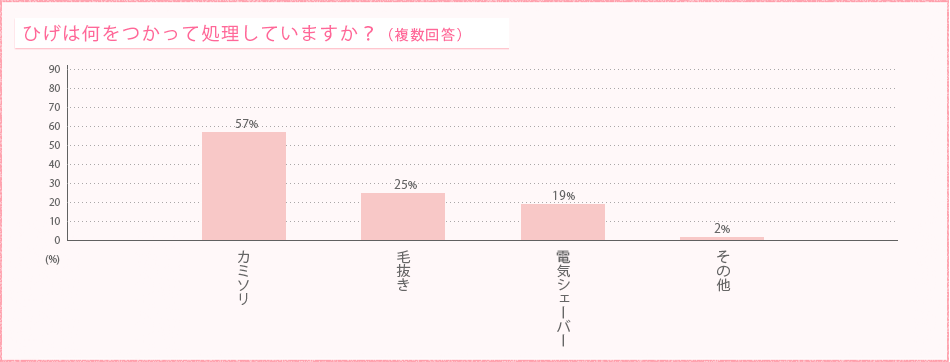 - 学生時代に口の周りに軽く産毛程度のひげが生えていたのですが、その時はあまり気にしていなかったが、友人が修学旅行で一緒の部屋になった時に一生懸命に毛抜きとカミソリでひげの手入れをしているのを見て、自分もやった方がいいのかなと思い、その時からひげの処理を意識し始めました。[30代 女性]