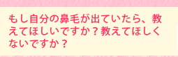 ひげ、鼻毛ともに鏡を見たことがきっかけで処理をする人が多かったですが、特に、1日の終わりに気がついてしまい、顔から火が出る思いをしたということも、意外と多いのではないでしょうか。もし鼻毛が出ていたら、教えてほしいかどうか伺ったところ、「教えてほしい(47%)」「どちらともいえない(43%)」と答えが分かれました。