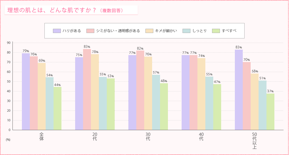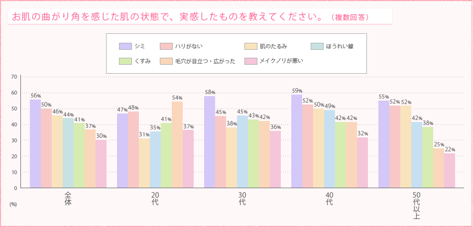 年代別の特徴としては、20代で「毛穴が目立つ・広がった」「目のしたのクマ」「メイクのりが悪い」という実感が他の年代より多く、30代以降になると「シミ」を、40、50代では「肌のたるみ」「ほうれい線」を実感している人が増えていることがわかります。