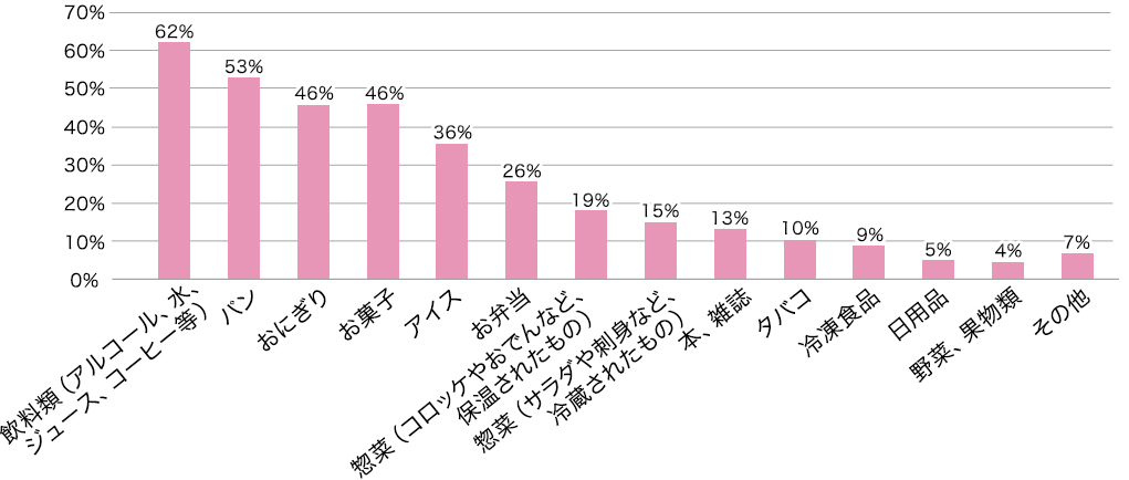 食べ物以外にも日用品や雑誌、たばこ等品揃えも豊富なコンビニ。その中でもどのようなものを購入しているケースが多いのか調べてみました。すると1位が「飲料類(アルコール、水、ジュース、コーヒー等)」、2位が「パン」、3位が「おにぎり」、4位が「お菓子」、5位「アイス」という結果に!食べ物と一緒にお茶やアルコールを買う方や、低価格のコンビニコーヒーの利用もあってか、食べ物を抜いて飲料類が上位にランクインしました。そして、食べ物では朝の忙しい時間帯や、小腹がすいた時に鞄の中からサッと取り出して食べられるパンや、おにぎりを購入する方が多いようです。その他では、自治体の粗大ごみ処理券や、ATM、チケット、公共料金の支払いなども挙がっていました。