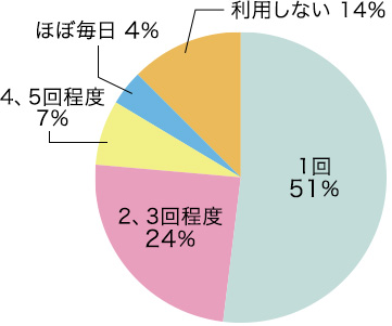 いつでも気軽に利用できるコンビニは、忙しい現代人の強い味方。昨今では、お弁当以外にもお刺身や果物などの生鮮食品も購入でき、近隣にスーパーが無いご高齢の方にも大変重宝されています。そこでたんぽぽメンバーの皆さんに、週に何回コンビニで買い物をするかを聞きました。すると、51%の方が週に1回は利用していると回答。続いて、2、3回程度が24%、4、5回程度が7%、ほぼ毎日が4%と、8割以上の方がコンビニを週に1回以上利用しているという結果になりました。