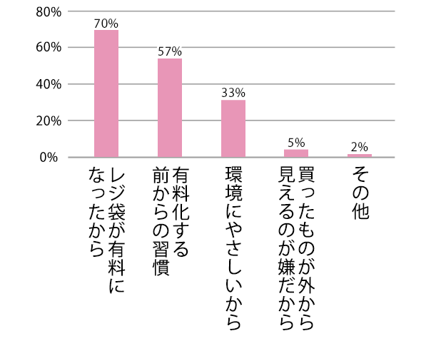 - エコが習慣になって良いと思います。今まで必要なくてももらっていたレジ袋が有料になった事で、本当に必要な時のみもらうようになりました。[30代 女性]