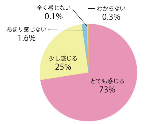 最初に「値上がりを感じますか」とお聞きしたところ、98%の方が「感じる」との回答でした。