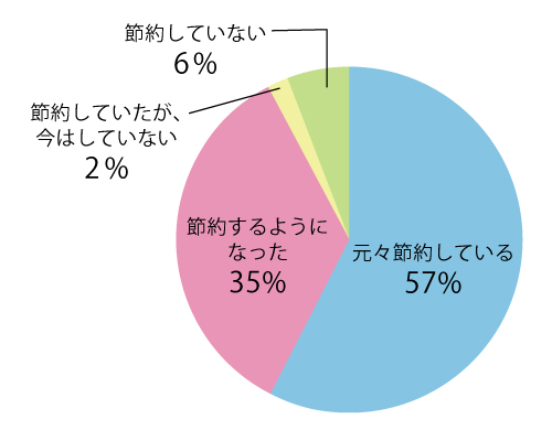 「元々節約している(57%)」の回答が最も多く、「節約するようになった(35%)」も合わせると9割以上の方が節約しているという結果でした。