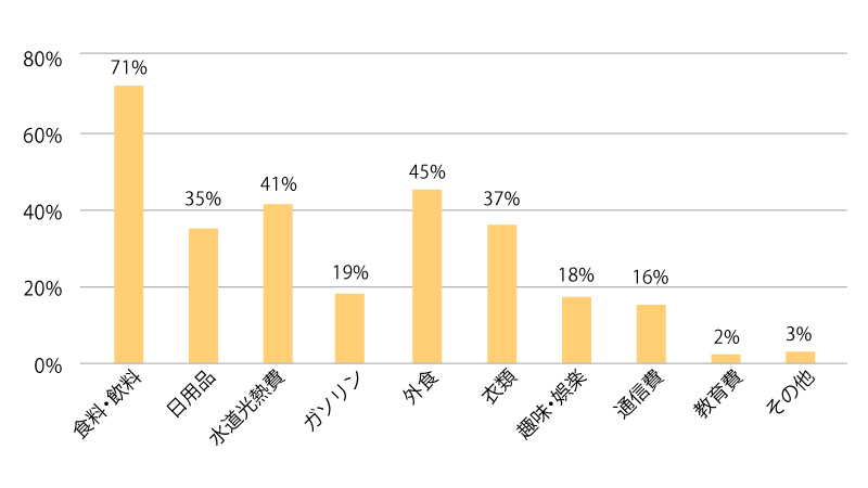 実際にどんなところで節約しているかを聞いたところ、一番多かったのが「食品・飲料(71%)」でした。続いて「外食」が45%で、飲食関係で節約している方が多く見られました。その他にも「水道光熱費(41%)」「衣類(37%)」「日用品(35%)」など、日常のものトータルで節約している印象でした。